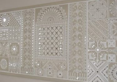 Lippan art, also known as Lippan Kaam, is a traditional Indian mud-relief work from the Kutch region of Gujarat, used for home decoration. It features intricate 3D designs made from a mixture of clay/mud (traditionally with camel dung binder) and decorated with embedded mirrors, creating textured and shimmering wall murals.