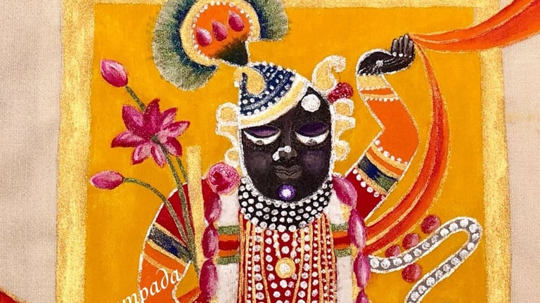 This art is from the town of Nathdwara in the state of Rajasthan in India. It was primarily the backdrop cloth behind the Shrinathji manifestation of Krishna (the child form).